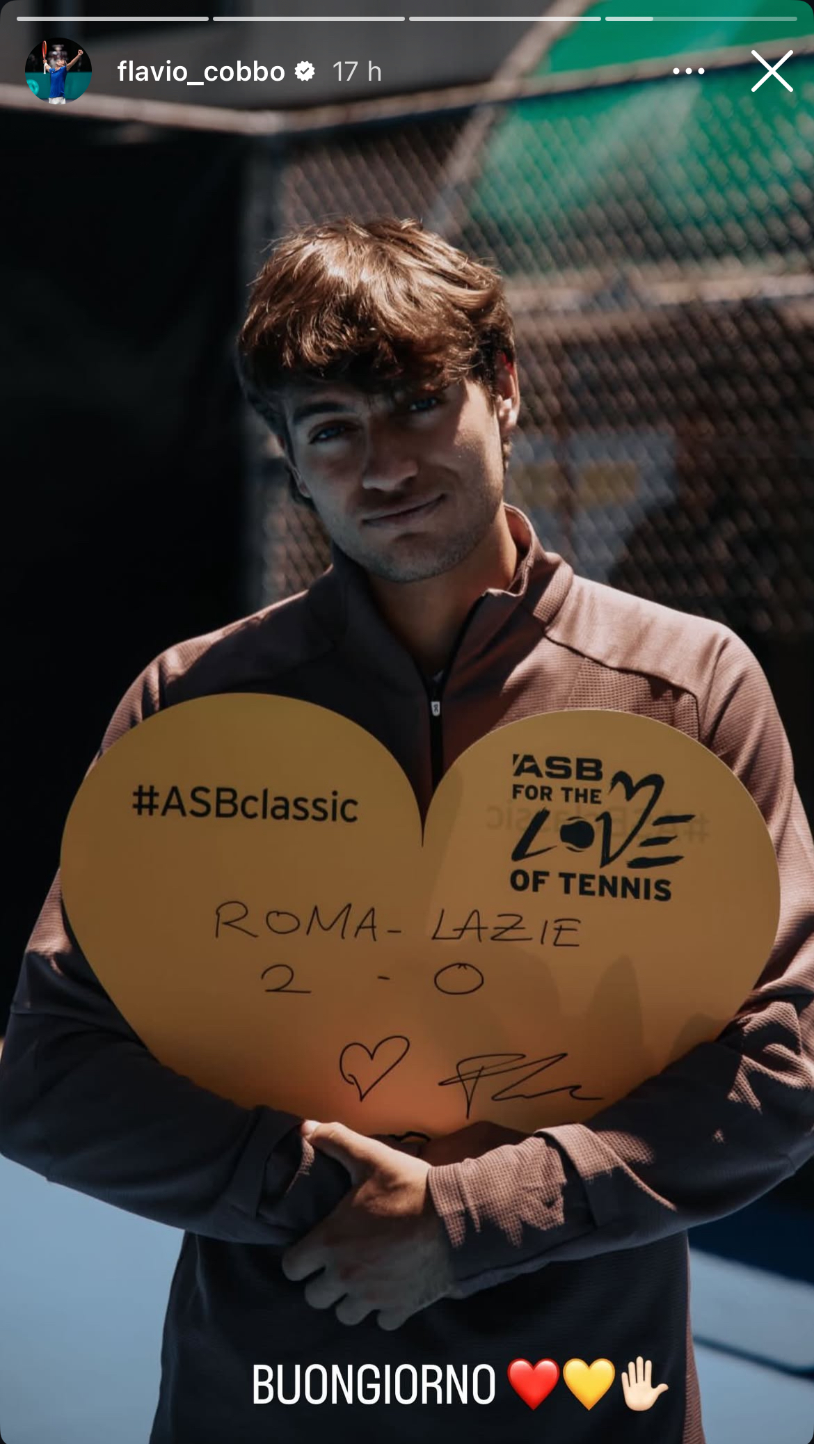 “Roma-Lazie 2-0”, con un cuore e la sua firma, sul cartello dell’ASB Classic: così esulta Flavio Cobolli su Instagram. Il tennista romano e romanista, impegnato in Nuova Zelanda per il torneo tennistico, ha esultato per la vittoria della Roma nel derby di ieri grazie alle reti di Pellegrini e Saelemaekers.