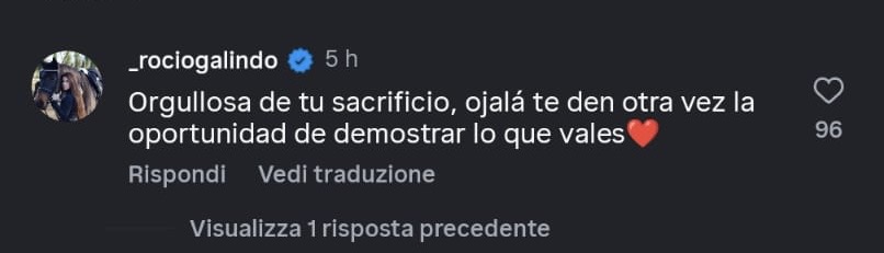 Sotto all’ultimo posto pubblicato da Angelino su Instagram, arriva il commento della moglie Rocio Galindo, che carica il marito: “Orgogliosa dei tuoi sacrifici, spero ti diano un’altra volta la possibilità di dimostrare quello che vali”.