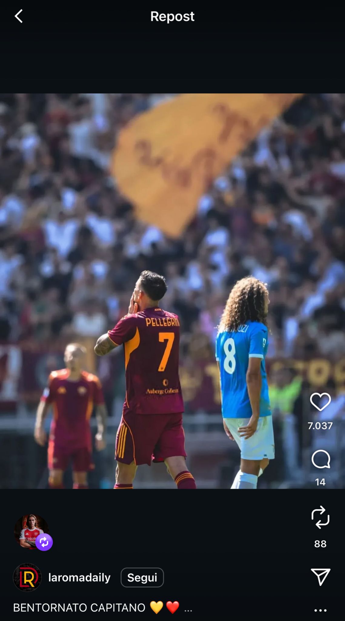 “Partita difficile ma grande vittoria di squadra. Contento del mio primo gol in questo stadio magnifico con tutta la nostra gente. Daje Roma”, aggiunge Mati Soulé.
