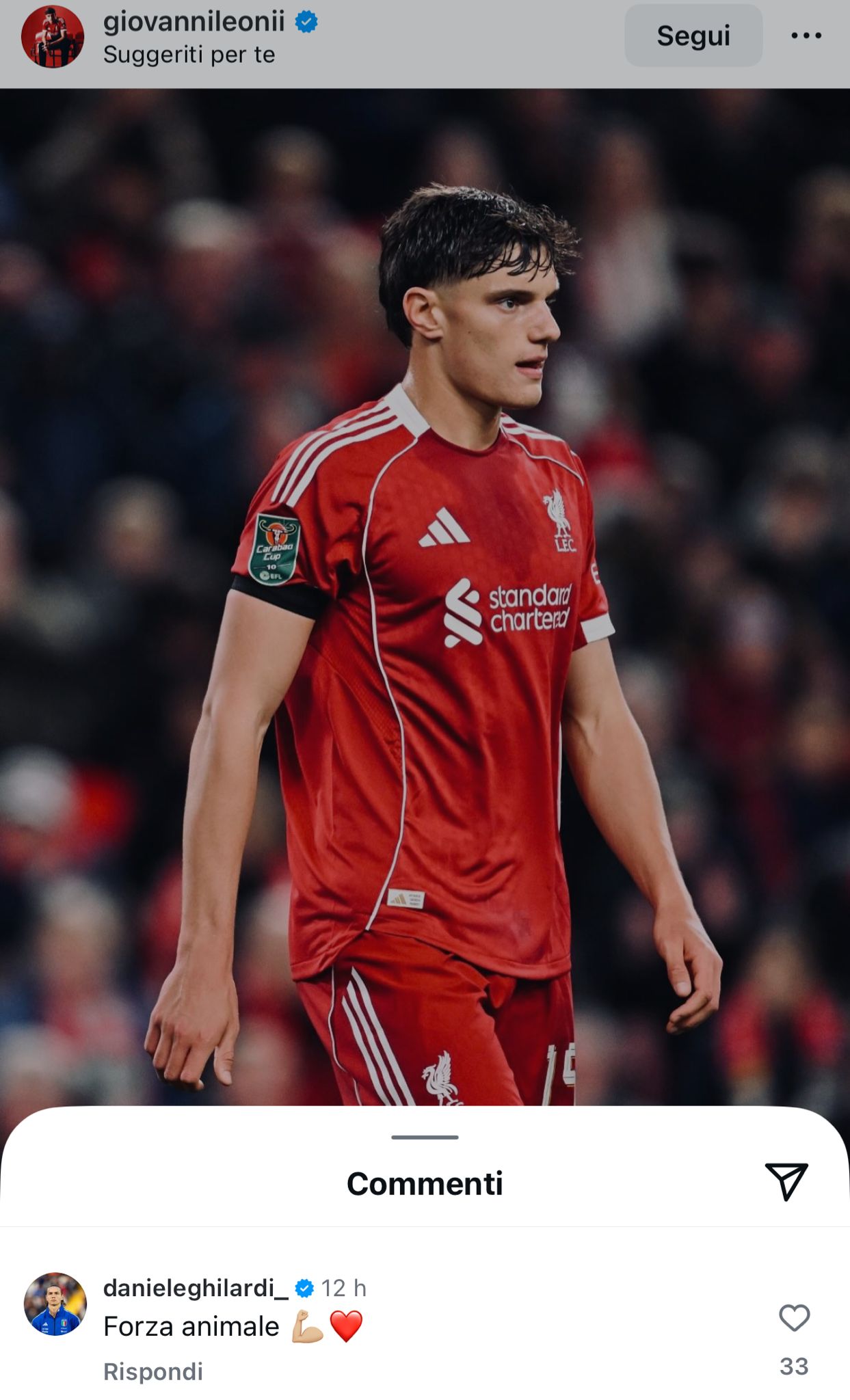 L’avventura di Giovanni Leoni al Liverpool è iniziata in modo davvero sfortunato. L’ex difensore centrale del Parma, alla sua prima gara con la maglia dei Reds, ha riportato la rottura del legamento crociato del ginocchio sinistro nel corso della partita di Carabao Cup contro il Southampton. Tra i tantissimi messaggi di vicinanza ricevuti sui social c’è anche quello del difensore della Roma Daniele Ghilardi: “Forza animale”, il messaggio del giallorosso su Instagram.