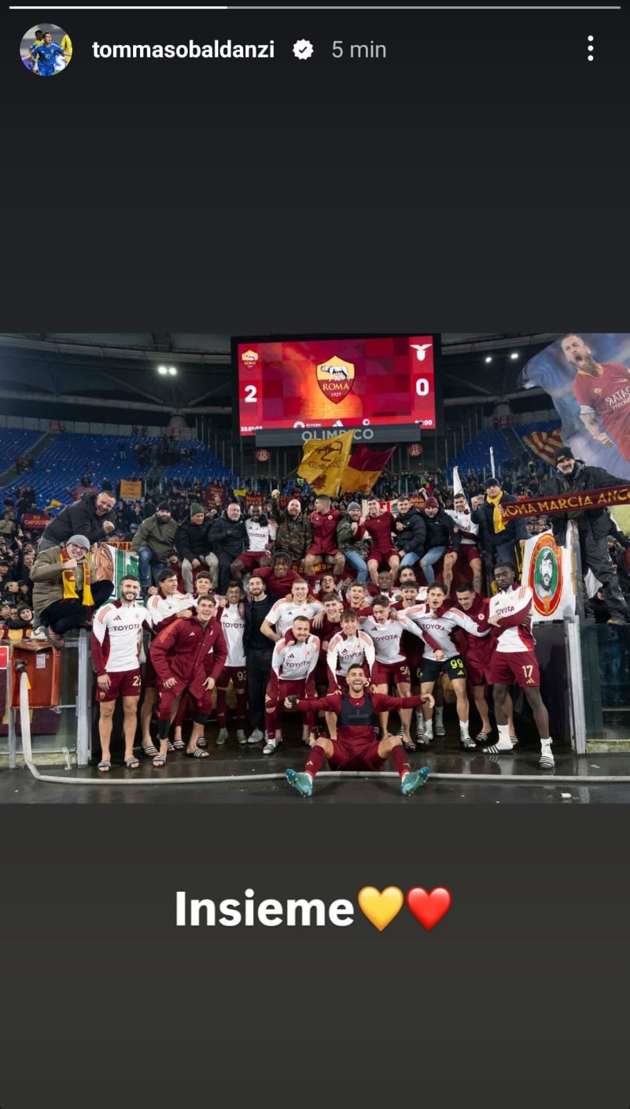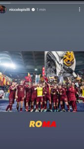 Anche Niccolò Pisilli ha espresso tutta la propria gioia. “Roma“, ha scritto il classe 2004 postando la foto della squadra sotto la Curva Sud. “Oggi come ieri… Roma è giallorossa”, scrive in un altro post.
