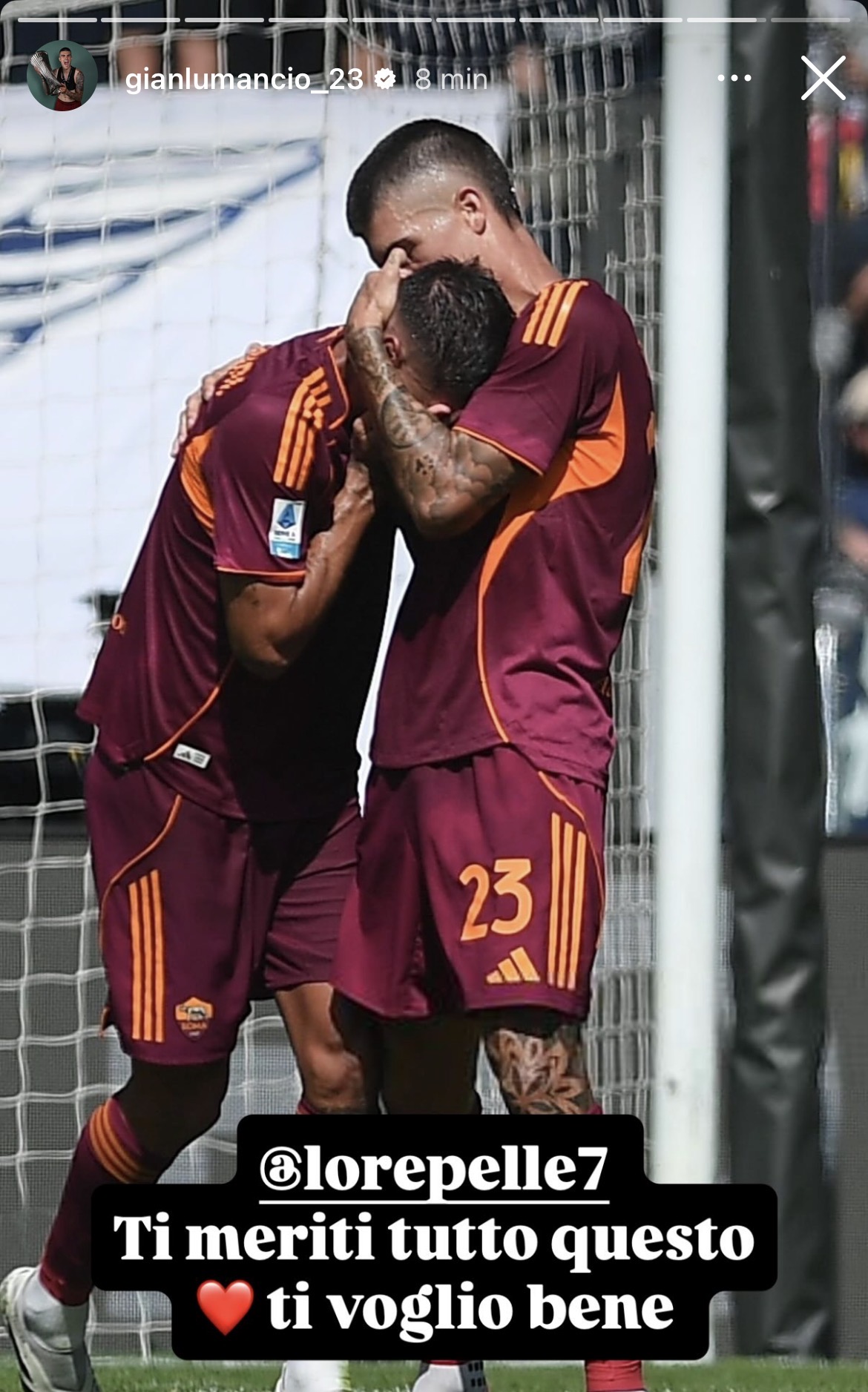 “AS Roma. Noi“, scrive Gianluca Mancini sempre su Instagram. “Ti meriti tutto questo, ti voglio bene”, il messaggio del difensore per Lorenzo Pellegrini.