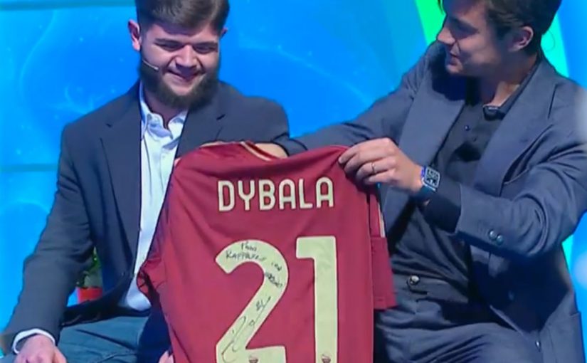 “So che ti piace tanto il calcio. Tifi Roma vero? Bravo! Da ora in poi inizierai a giocare con un’altra maglia”, sorride il numero 21, il quale regala a Raffaele una maglia della Roma autografata. Inoltre Dybala consegna al ragazzo un altro regalo: “Ci porti a cena tua zia”, la raccomandazione di Paulo. Alla fine Maria De Filippi apre la busta e scatta l’abbraccio tra la zia, il nipote e la Joya.