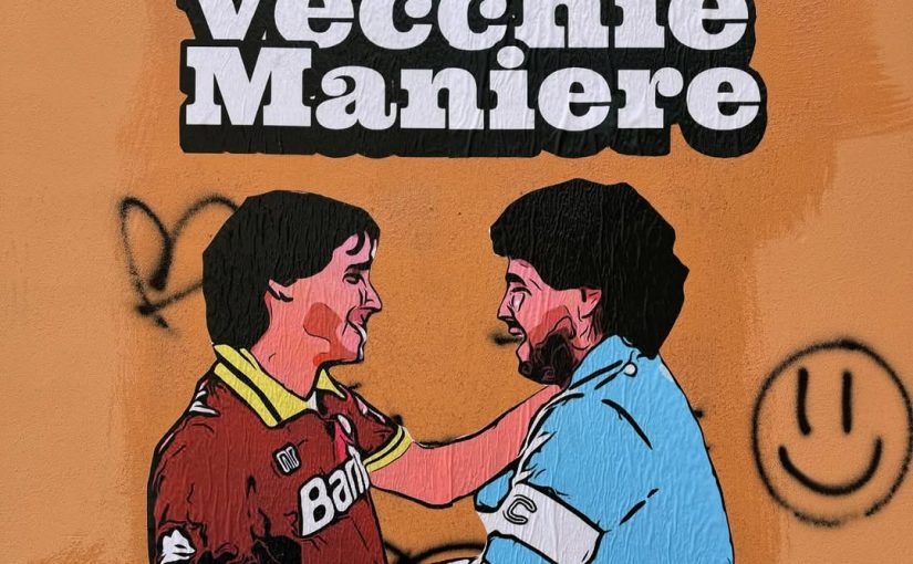 In attesa della sfida tra Roma e Napoli, nelle strade della Capitale, precisamente in Via Teulada, è apparso un murale dedicato a Bruno Conti e Diego Armando Maradona. L’opera è stata realizzata dall’artista Drugi, noto street artist autore anche del murale di Ranieri a Testaccio.