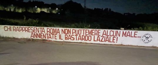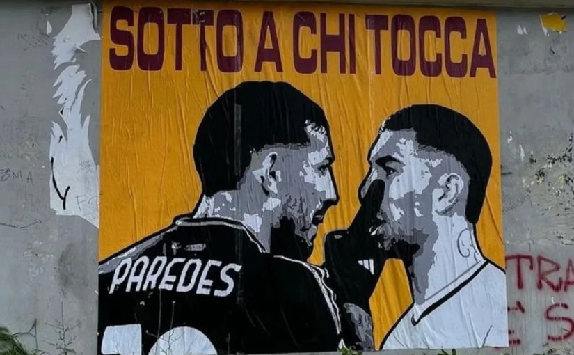Il clima alla vigilia del Derby della Capitale, in programma domani alle ore 20:45 allo Stadio Olimpico, inizia a scaldarsi. Questa notte all’esterno del centro sportivo ‘Fulvio Bernardini’ di Trigoria sono stati esposti due striscioni: il primo recita “Chi rappresenta Roma non può temere alcun male… Annientate il b******o laziale!”, mentre nel secondo è ripresa la scena in cui Leandro Paredes zittisce Mattia Zaccagni ed è accompagnata dalla scritta “Sotto a chi tocca”.
