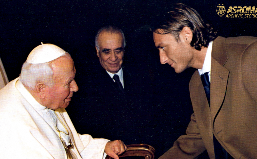 La Roma ripercorre, infatti, come eventi significativi della storia giallorossa si siano spesso intrecciati temporalmente con i cambi al soglio pontificio. Ad esempio, la primissima partita ufficiale del club, Roma-Livorno 2-0 del 25 settembre 1927, si giocò sotto il pontificato di Pio XI, eletto cinque anni prima della fondazione della società. Oppure, più recentemente, la prima partita nell’era di Papa Francesco, eletto il 13 marzo 2013, vide la Roma vincere 2-0 contro il Parma il 17 marzo successivo, con reti di Lamela e Totti. Questi sono solo alcuni degli aneddoti che legano, seppur indirettamente, la storia della Roma a quella dei Papi che si sono succeduti dal 1927. Il club ricorda gli incontri di delegazioni giallorosse con i Pontefici, come quello del 1977 con Paolo VI (presenti tra gli altri Santarini, Liedholm e Ranieri), quello del 2000 con Giovanni Paolo II (con Totti e il presidente Franco Sensi) e del 2016 con Papa Francesco.