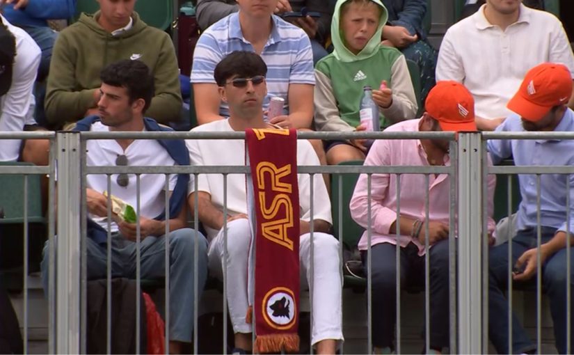 In questi giorni sta andando in scena a Londra il torneo di Wimbledon, uno dei più iconici nel mondo del tennis. Tra i protagonisti di oggi c’è il romano e romanista Flavio Cobolli, il quale sta affrontando il ceco Jakub Mensik nel match valido per il terzo turno. Sono tanti i sostenitori presenti sul campo numero 12 dell’All England Club e tra loro c’è anche un tifoso della Roma che ha portato con sé una sciarpa giallorossa.