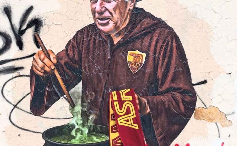 Nella Capitale è apparso uno splendido murale dedicato a Gian Piero Gasperini ed è l’ultimo capolavoro realizzato alla Garbatella dal noto artista di strada Drugi. L’allenatore della Roma veste i panni di un mago e mescola nel suo calderone i tre ingredienti che lo contraddistinguono: grinta, cuore e sudore. Intanto nella mano sinistra tiene la sciarpa giallorossa.