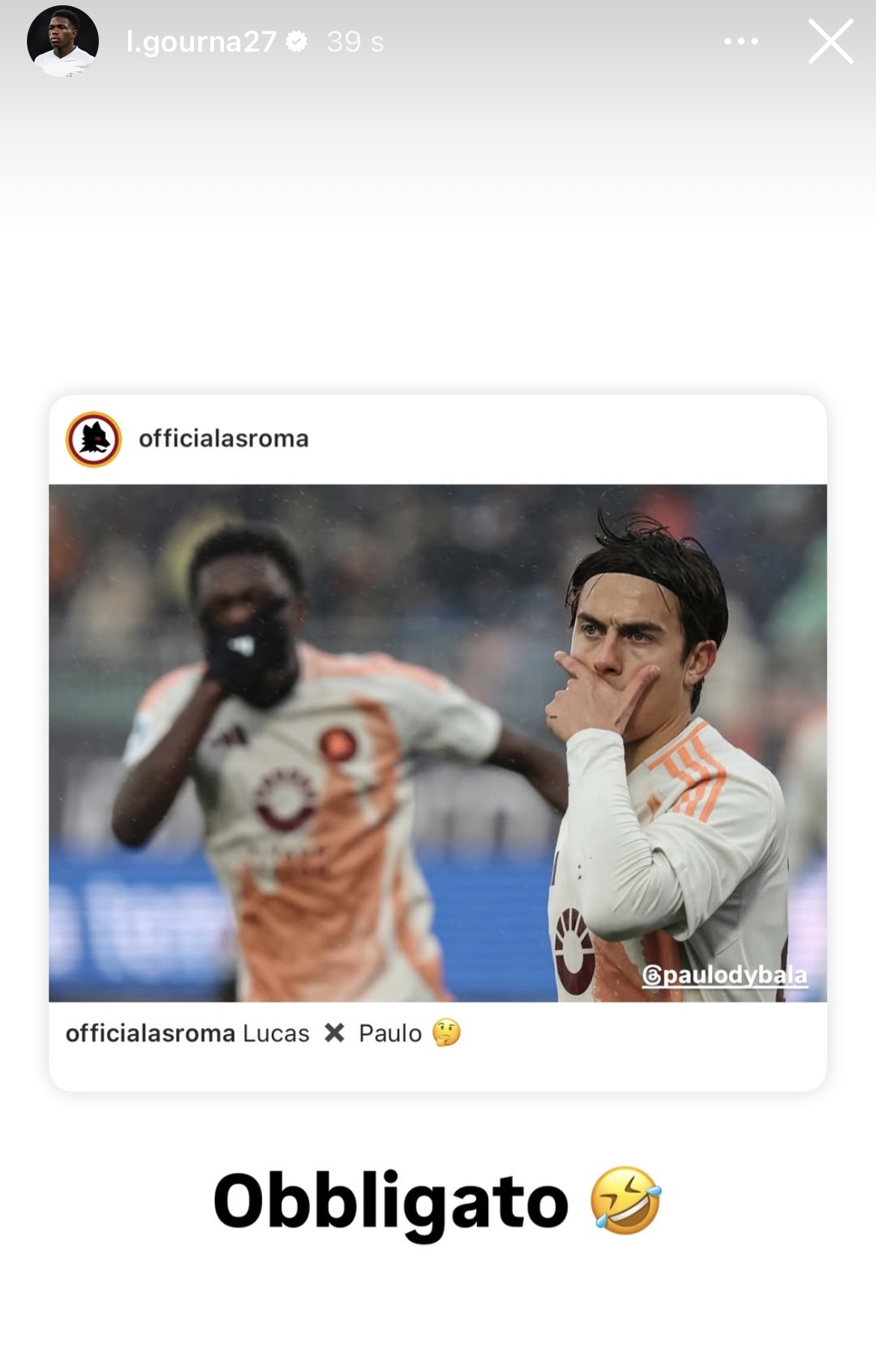 Su Instagram Lucas Gourna-Douath ha scherzato sull’esultanza scrivendo: “Obbligato”.