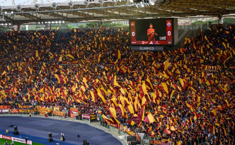 Allo Stadio Olimpico va in scena la delicatissima sfida tra Roma e Fiorentina, valida per la trentacinquesima giornata di Serie A, e tutti i settori dello stadio si sono tinti di giallorosso. Come da indicazione della Curva Sud, i romanisti hanno colorato l’Olimpico sventolando le bandiere già utilizzate in occasione del match europeo contro l’Athletic Club e hanno regalato un colpo d’occhio spettacolare soprattutto durante l’inno.
