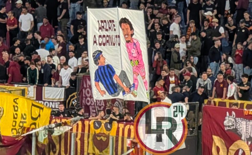 Allo Stadio Olimpico va in scena la partita tra Roma e Milan e in occasione di questa gara la Curva Sud ha sfoggiato una nuova pezza. I tifosi hanno deciso di rappresentare su un telo bianco Mile Svilar e la caduta dell’invasore dell’Atalanta: “Arzate a cornuto”, la scritta che affianca l’immagine dell’episodio accaduto lunedì scorso.
