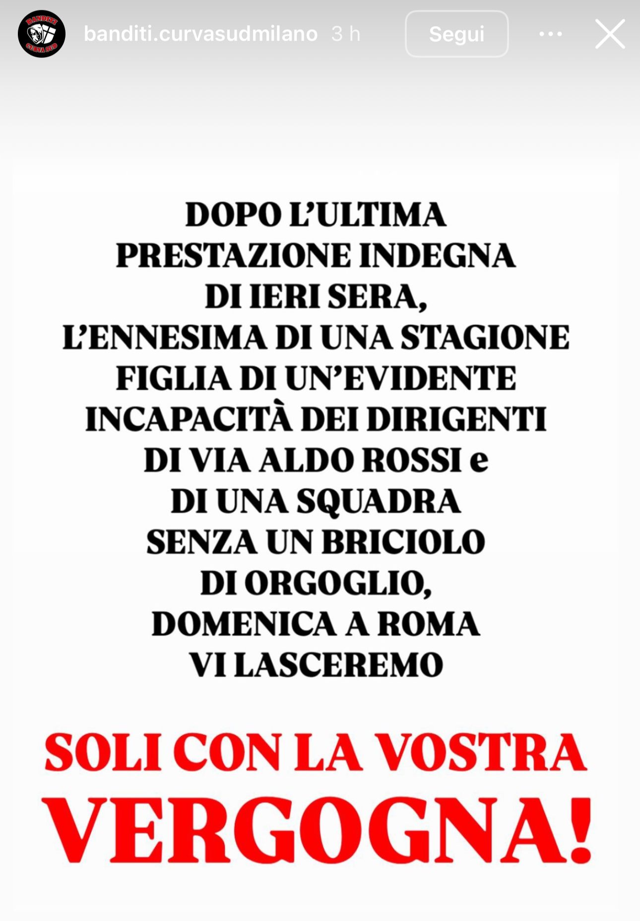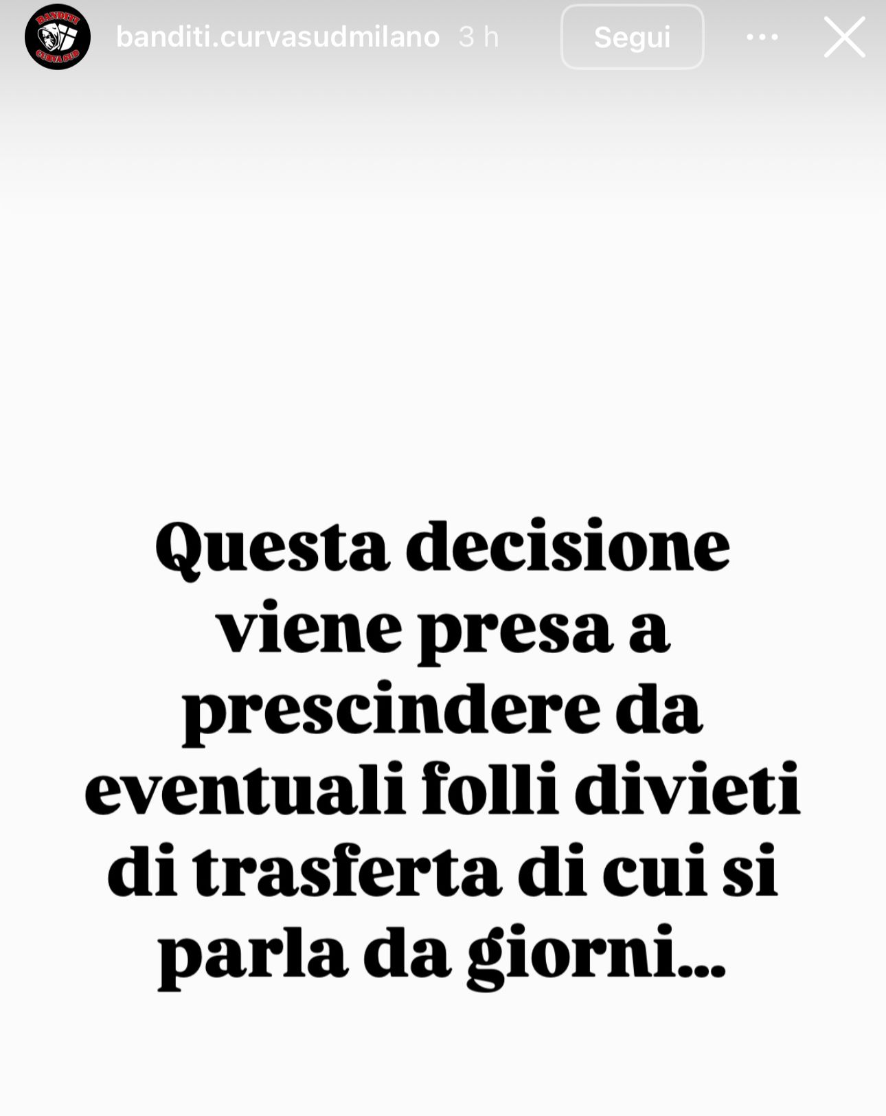 Poco prima della decisione del Questore la Curva Sud Milano aveva annunciato tramite alcune storie pubblicate su Instagram la decisione di non seguire la squadra all’Olimpico in vista di Roma-Milan: “Dopo l’ultima prestazione indegna di ieri sera, l’ennesima di una stagione figlia di un’evidente incapacità dei dirigenti di via Aldo Rossi e di una squadra senza un briciolo di orgoglio, domenica a Roma vi lasceremo soli con la vostra vergogna! Questa decisione viene presa a prescindere da eventuali folli divieti di trasferta di cui si parla da giorni…”.