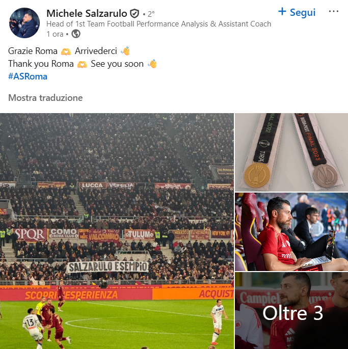 Michele Salzarulo lascia la Roma. Il match analyst era tornato nel club giallorosso con l’arrivo di Ivan Juric sulla panchina della Roma e ora ha comunicato di lasciare la società con un post su Linkedin. “Grazie Roma, arrivederci“, il suo commento.