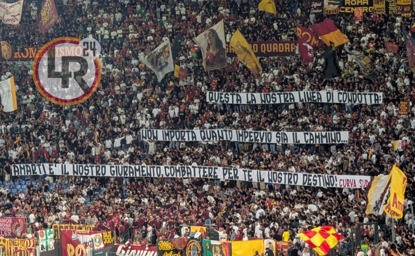 Al via la stagione della Roma 2025/26: allo Stadio Olimpico la Roma di Gian Piero Gasperini riceve il Bologna nella prima di campionato. Prima del fischio d’inizio la Curva Sud ha esposto uno striscione: “Questa la nostra linea di condotta: non importa quanto impervio sia il cammino… amarti è il nostro giuramento, combattere per te il nostro destino!”.