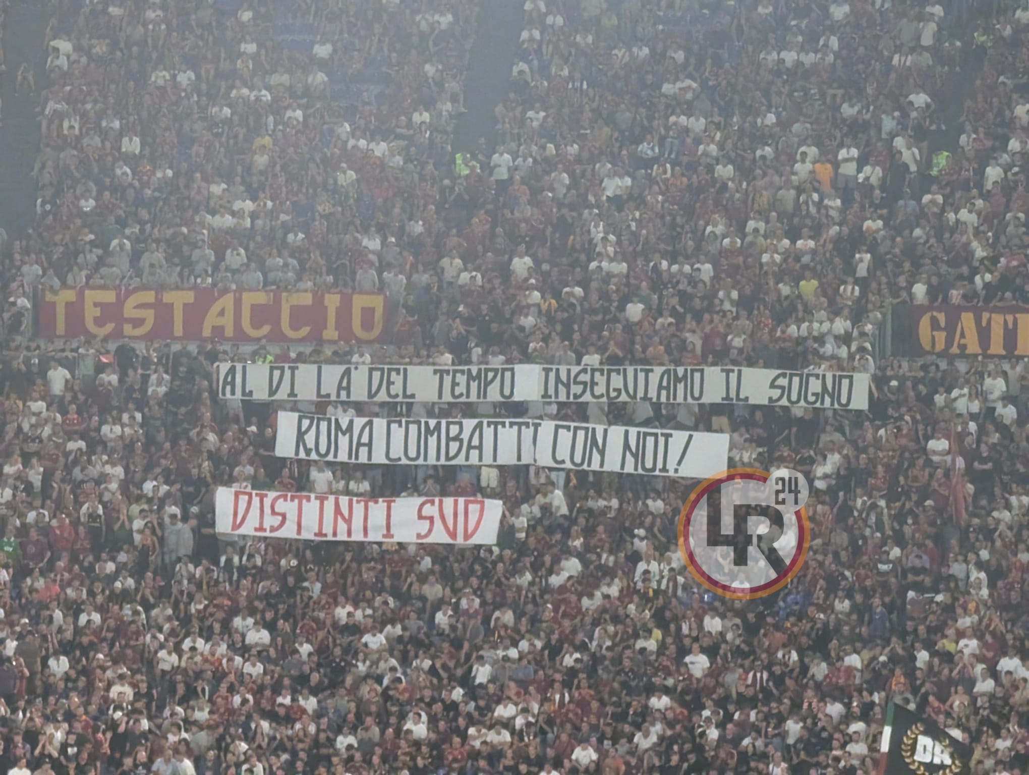 Anche in Distinti Sud è apparso uno striscione: “Al di là del tempo inseguiamo il sogno, Roma combatti con noi!”.