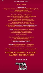 In vista del derby Lazio-Roma di domani all’ora di pranzo, la Curva Sud ha rilasciato un comunicato su Instagram per invitare tutto il tifo giallorosso ad attenersi alle proprie regole. Questo il messaggio condiviso sui social.