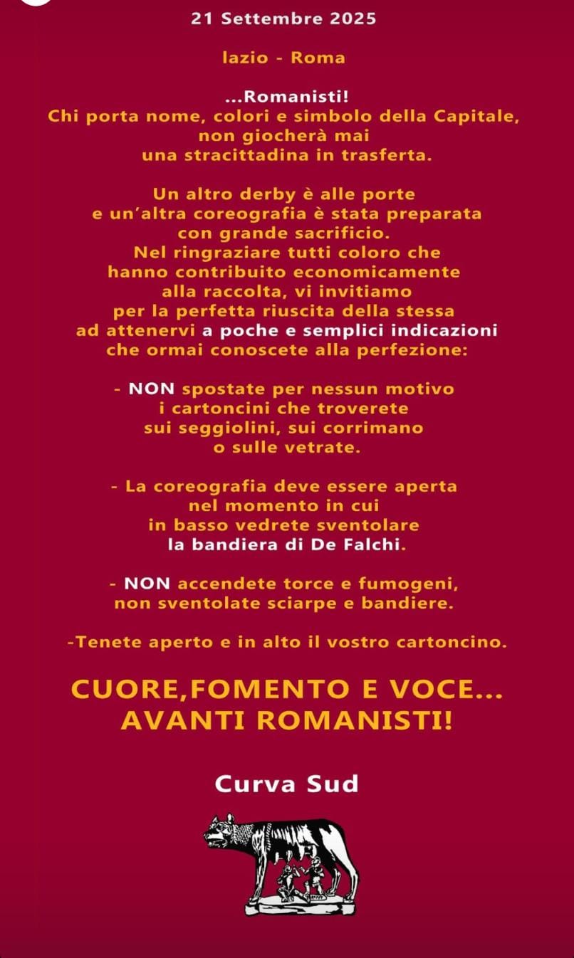 In vista del derby Lazio-Roma di domani all’ora di pranzo, la Curva Sud ha rilasciato un comunicato su Instagram per invitare tutto il tifo giallorosso ad attenersi alle proprie regole. Questo il messaggio condiviso sui social.