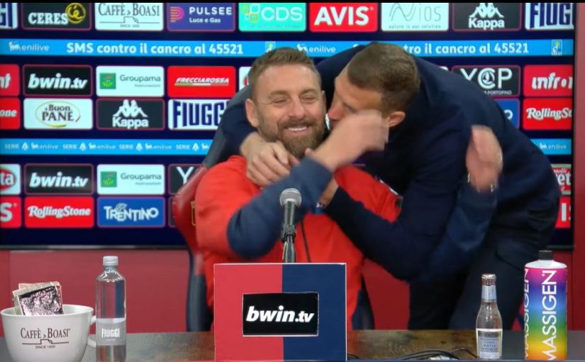 Alle 15:00 Daniele De Rossi ha fatto il suo esordio sulla panchina del Genoa, ottenendo un 2-2 contro la Fiorentina. Tra le file viola milita anche Edin Dzeko, ex compagno di DDR alla Roma. I due erano molto legati e il bosniaco lo ha dimostrato anche oggi. Non avendolo potuto salutare in campo (il neo tecnico del Grifone era squalificato), l’attaccante classe 1986 ha deciso di fargli una sorpresa ed irrompere durante la conferenza stampa di De Rossi. Tra loro un saluto affettuoso ed un abbraccio. Dzeko si è scusato dicendo: “Scusate ragazzi, gli do un bacio”. Di tutta risposta, l’ex capitano e allenatore della Roma: “Quando è entrato in campo ero sicuro che mi avrebbe fatto gol”.