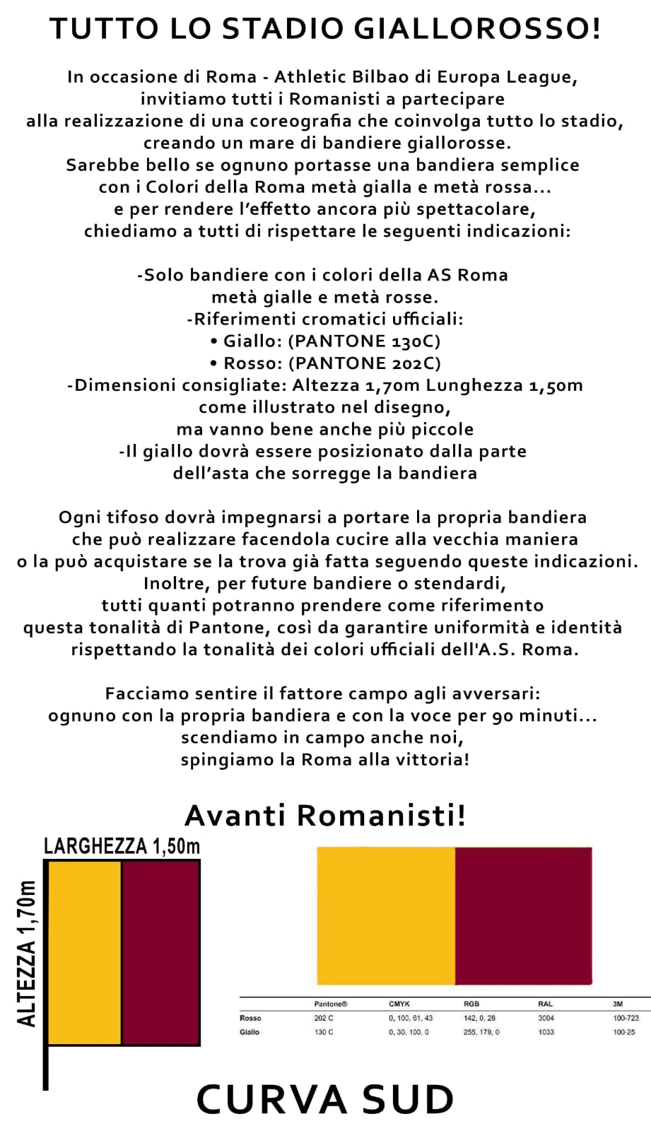Giovedì 6 marzo alle ore 21 andrà in scena allo Stadio Olimpico la partita tra Roma e Athletic Club, valida per l’andata degli ottavi di finale di Europa League. In occasione di questo fondamentale big match europeo la Curva Sud è intenzionata a preparare una coreografia che coinvolga tutti i tifosi presenti allo stadio. Ecco il messaggio: “TUTTO LO STADIO GIALLOROSSO! In occasione di Roma – Athletic Bilbao di Europa League, invitiamo tutti i Romanisti a partecipare alla realizzazione di una coreografia che coinvolga tutto lo stadio, creando un mare di bandiere giallorosse. Sarebbe bello se ognuno portasse una bandiera semplice con i Colori della Roma metà gialla e metà rossa…. e per rendere l’effetto ancora più spettacolare, chiediamo a tutti di rispettare le seguenti indicazioni: solo bandiere con i colori della AS Roma metà gialle e metà rosse; riferimenti cromatici ufficiali (giallo: PANTONE 130C; rosso: PANTONE 202C); dimensioni consigliate: altezza 1,70m e lunghezza 1,50m, come illustrato nel disegno, ma vanno bene anche più piccole; il giallo dovrà essere posizionato dalla parte dell’asta che sorregge la bandiera. Ogni tifoso dovrà impegnarsi a portare la propria bandiera che può realizzare facendola cucire alla vecchia maniera o la può acquistare se la trova già fatta seguendo queste indicazioni. Inoltre, per future bandiere o stendardi, tutti quanti potranno prendere come riferimento questa tonalità di Pantone, così da garantire uniformità e identità rispettando la tonalità dei colori ufficiali dell’A.S. Roma. Facciamo sentire il fattore campo agli avversari: ognuno con la propria bandiera e con la voce per 90 minuti… scendiamo in campo anche noi, spingiamo la Roma alla vittoria! Avanti Romanisti!”.