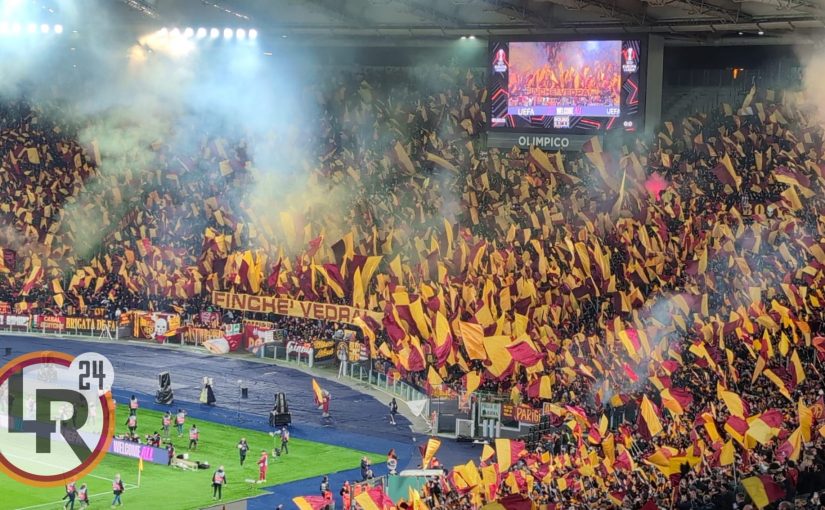 Lo Stadio Olimpico si tinge di giallorosso restituendo un’atmosfera da brividi. La Roma riceve in casa l’Athletic Club nella sfida valida per l’andata degli ottavi di finale di Europa League e, come da indicazione della Curva Sud, i romanisti riempiono lo stadio con bandiere giallorosse sventolate dal momento del riscaldamento della squadra e accompagnando anche l’iconico inno. In Curva Sud viene poi esposto lo striscione: “Finché vedrai…”, che richiama il coro “Finché vedrai, sventolar questa bandiera…”.