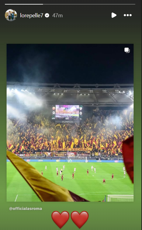 Ieri Lorenzo Pellegrini non è sceso in campo nel match vinto contro l’Athletic Club, ma ha comunque potuto gustarsi lo spettacolo offerto dai tifosi della Roma sugli spalti. Il Capitano giallorosso ha dedicato una storia Instagram alla Curva Sud, pubblicando le immagini postate dai canali ufficiali del club commentando con due cuori.