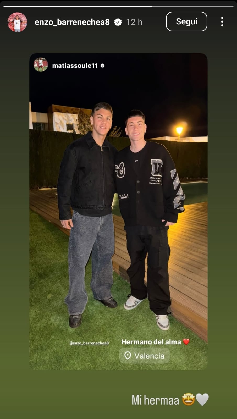 Chiamato a sostituire Paulo Dybala sul campo nel momento cruciale della stagione giallorossa, ieri sera Matias Soulé si è concesso una visita a Valencia per andare a trovare l’ex compagno di squadra e connazionale Enzo Barrenechea, centrocampista con cui ha giocato insieme con le maglie di Juventus e Frosinone: “Fratello d’anima”.