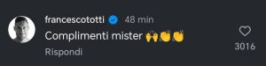 Con la vittoria sul Cagliari, il Napoli, nella serata ieri, ha alzato al cielo il quarto Sudetto della sua storia, il secondo negli ultimi 3 anni. Un capolavoro che porta la firma di Antonio Conte. E i complimenti al tecnico sono arrivati anche da Francesco Totti, che ha commentato un post dell’allenatore scrivendo: “Complimenti mister”