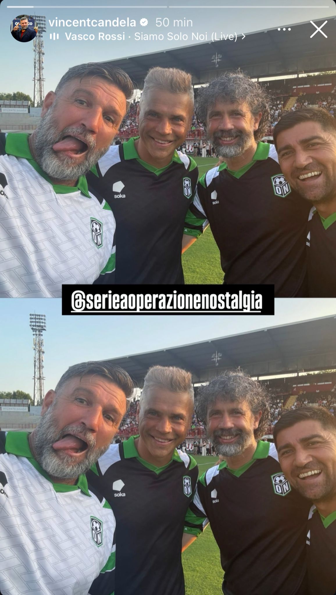 Allo stadio Romeo Menti di Vicenza è in corso la partita organizzata da Operazione Nostalgia, che vede in campo tante vecchie glorie del passato. Tra queste c’è anche una folta rappresentanza a tinte giallorosse, da due protagonisti dell’ultimo Scudetto come Vincent Candela e Damiano Tommasi, a David Pizarro, passando anche per Max Tonetto. Non solo loro però, perché calcheranno il campo da gioco anche Francesco Totti, Aldair, Simone Perrotta e Pietro Vierchowod. Di seguito lo scatto postato da Candela sul proprio account Instagram.
