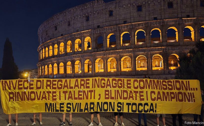 Striscione dei tifosi della Roma indirizzato alla proprietà giallorossa, l’argomento è Mile Svilar. Ecco il messaggio dei sostenitori della Roma, esposto davanti al Colosseo: “Invece di regalare ingaggi e commissioni…rinnovate i talenti, blindate i campioni. Mile Svilar non si tocca“.