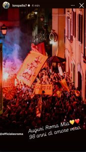La festa per il 98esimo anniversario della Roma ha colorato nella serata di ieri la Capitale di giallorosso. Il capitano Lorenzo Pellegrini ha celebrato la festa tramite il suo profilo Instagram, dove in una storia ha scritto: “Auguri Roma mia, 98 anni di amore vero“.