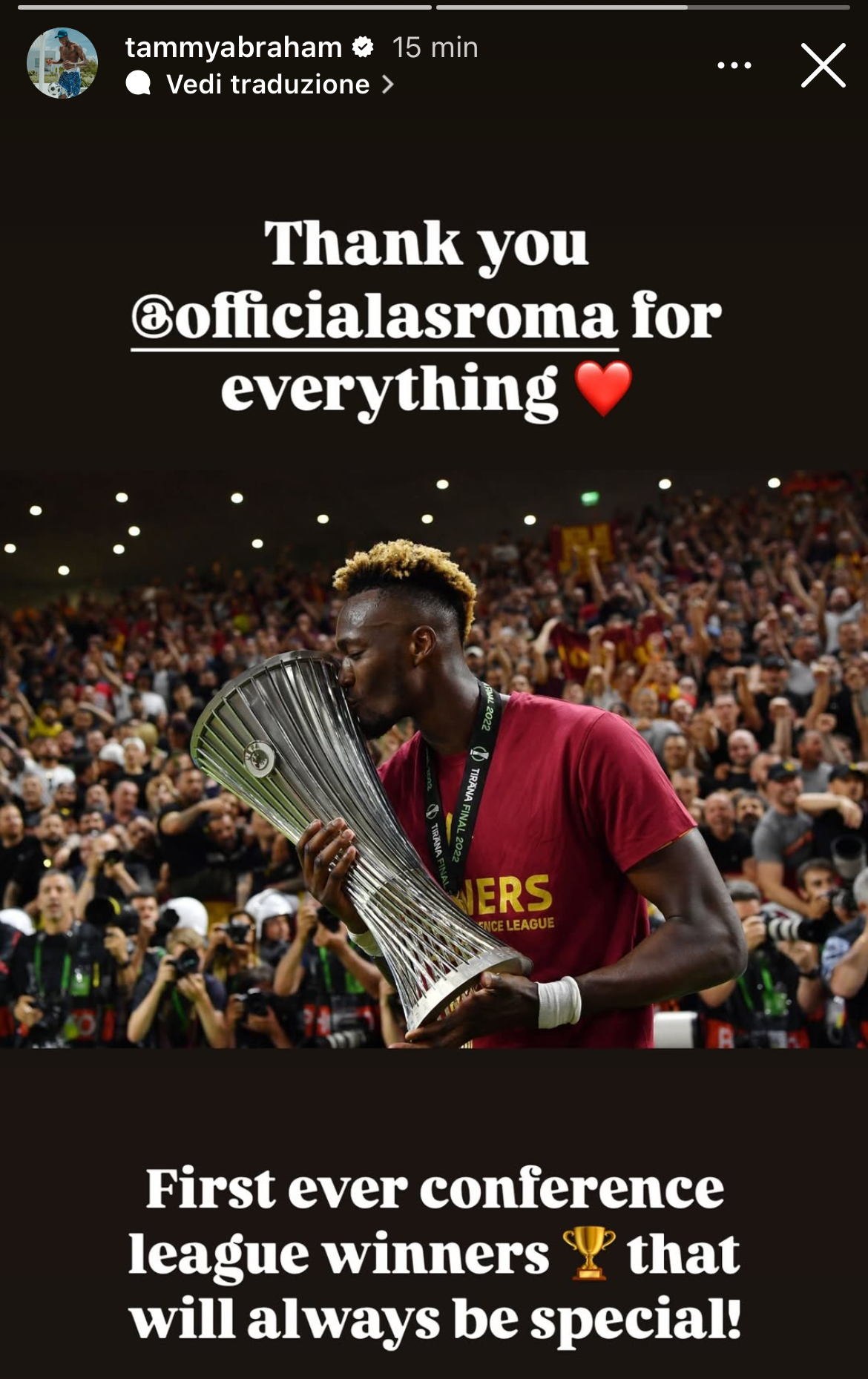Tammy Abraham ha salutato la Roma con una storia su Instagram: “Grazie di tutto. I primi vincitori della Conference League, sarà per sempre speciale”.