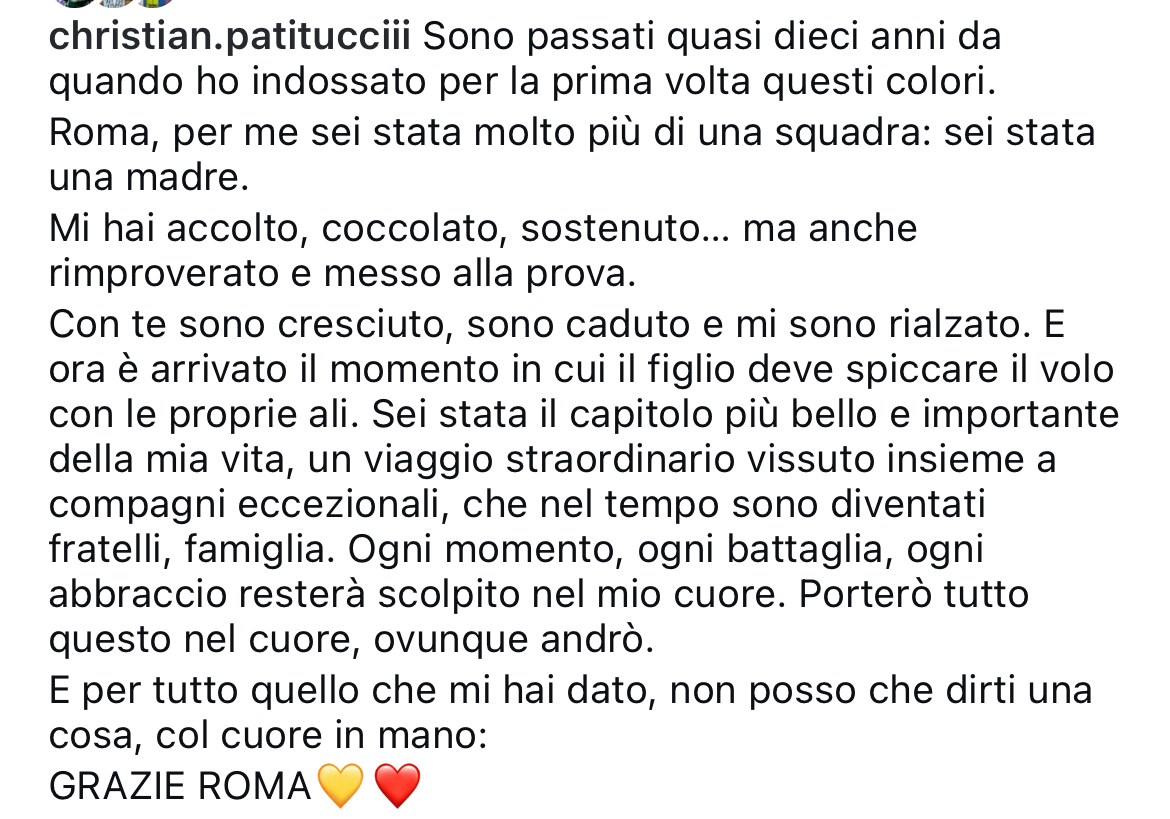 Il 2008 della #AsRoma Christian #Patitucci saluta il club con un post sui social: #Bologna e #Cremonese sulle sue tracce. Chi lo prenderà, oltre tutto a zero, potrebbe ritrovarsi una piacevolissima sorpresa. Giocatore molto futuribile.#calciomercato pic.twitter.com/FdSIqLTgto
