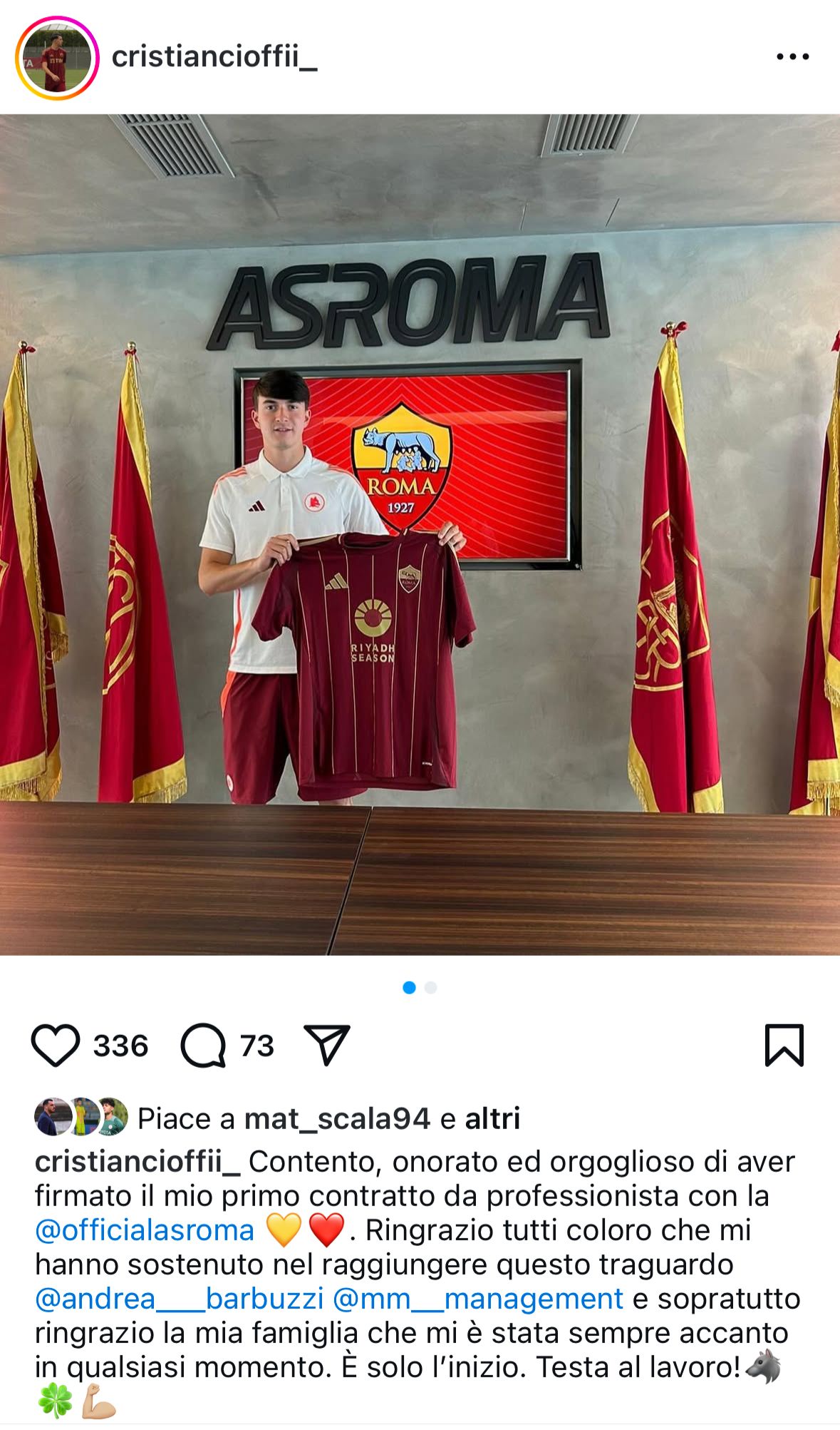 Un giorno speciale per Cristian Cioffi. Il difensore classe 2009, infatti, ha da poco firmato il suo primo contratto da professionista con la Roma Under 17. A comunicare la notizia è stato il calciatore stesso tramite un post pubblicato sul suo profilo Instagram. Il 16enne nato a Caserta ha poi aggiunto: “Contento, onorato ed orgoglioso di aver firmato il mio primo contratto da professionista con la Roma. Ringrazio tutti coloro che mi hanno sostenuto nel raggiungere questo traguardo e soprattutto ringrazio la mia famiglia che mi è stata sempre accanto in qualsiasi momento. È solo l’inizio. Testa al lavoro!”.