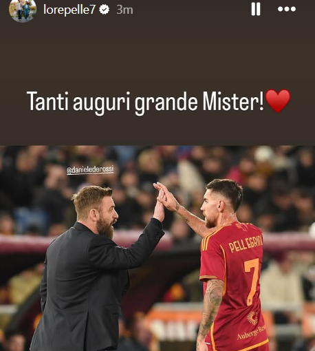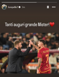 Da un capitano all’altro. Si unisce alle celebrazioni social anche Lorenzo Pellegrini, che su Instagram ha pubblicato una storia che li ritrae a festeggiare dopo un gol: “Tanti auguri grande Mister“.