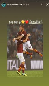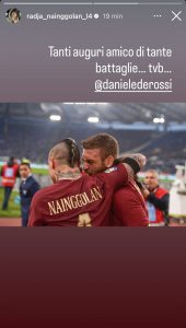 Gli ex compagni di squadra Radja Nainggolan e Kevin Strootman hanno dimostrato il proprio affetto per De Rossi attraverso Instagram: “Tanti auguri amico di tante battaglie, ti voglio bene“, ha scritto il belga. “Auguri amico mio“, è il messaggio dell’olandese.