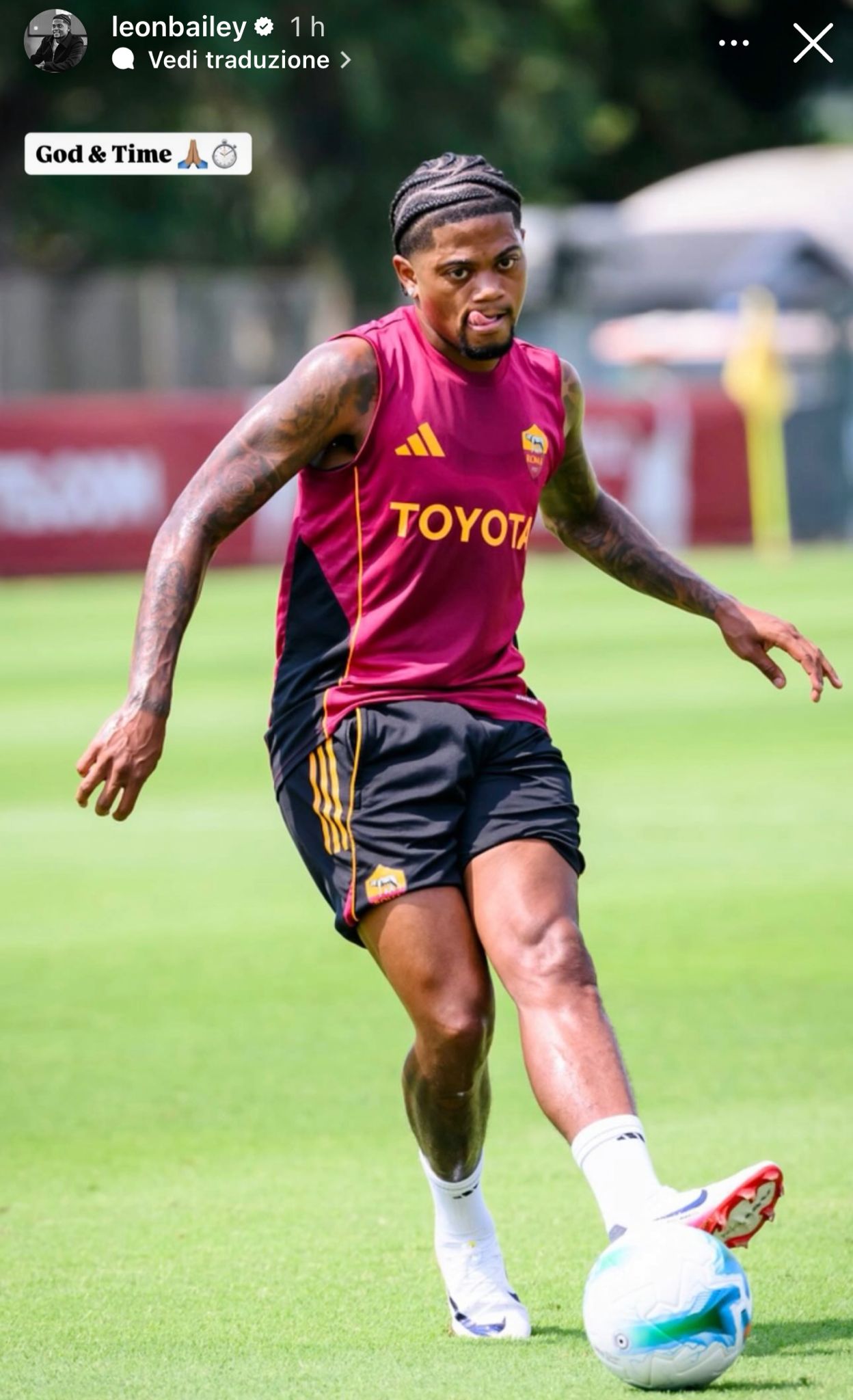 L’avventura di Leon Bailey alla Roma è partita con il piede sbagliato. L’esterno giamaicano è stato costretto a fermarsi al primo allenamento e ha riportato una sospetta lesione miotendinea del retto femorale destro, che lo potrebbe tenere lontano dal terreno di gioco per oltre 3 settimane. Il giocatore vuole tornare in campo il prima possibile per dimostrare tutto il suo valore e su Instagram ha pubblicato uno scatto della seduta con la didascalia “Dio e tempo”.