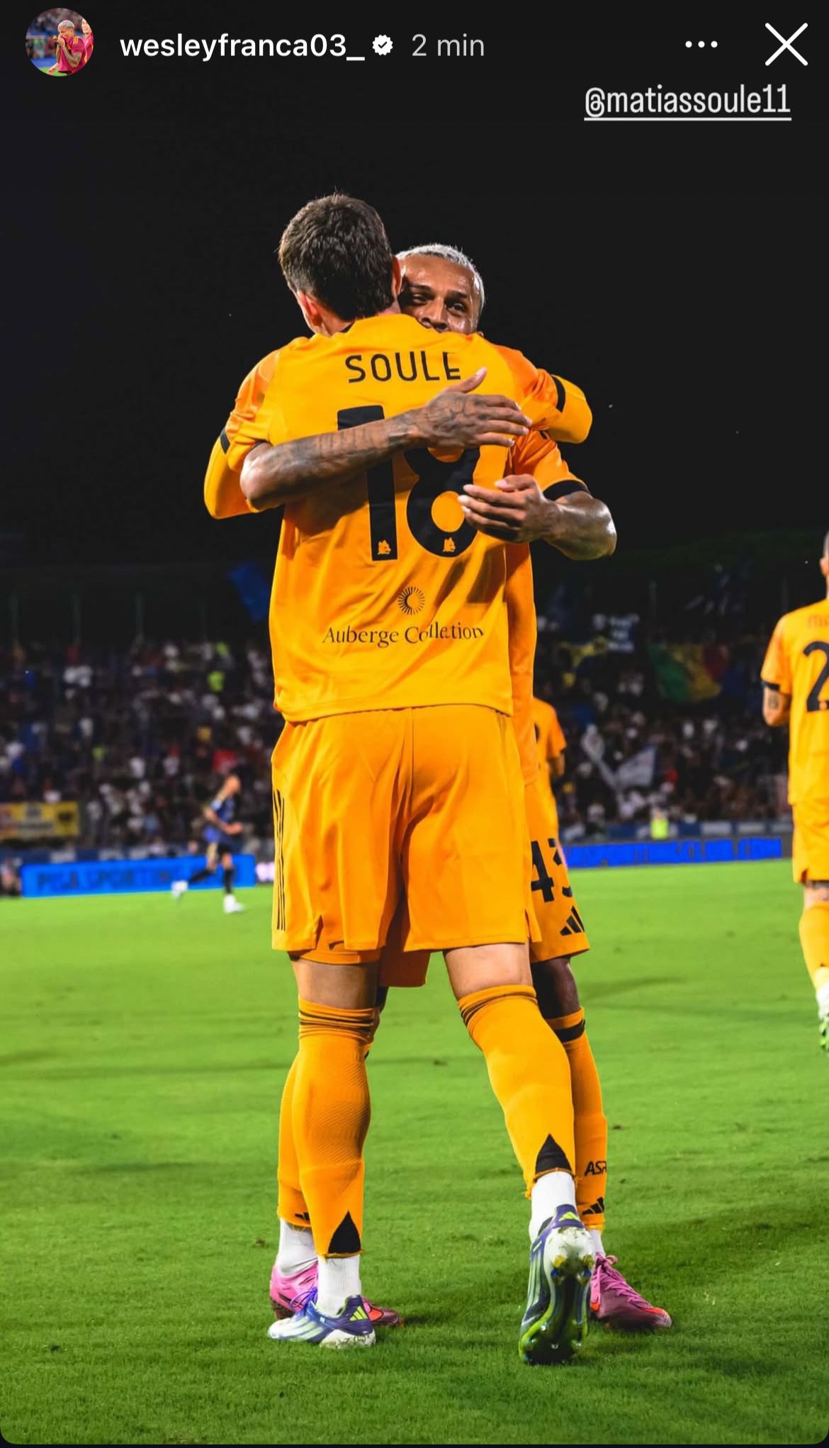 Wesley celebra il successo con una stories su Instagram insieme al match winner Matias Soulé e con un post.