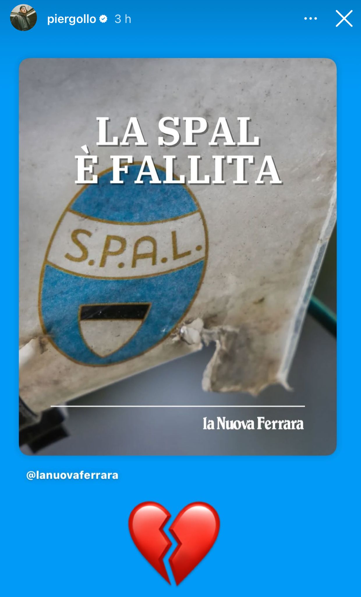 Nella giornata di ieri la SPAL di Joe Tacopina e Marcello Follano è ufficialmente fallita. La società di Ferrara non si è iscritta al campionato di Serie C 2025/26, motivo per cui ripartirà dall’Eccellenza. Tra i vari commenti sui social spicca quello di Pierluigi Gollini, il quale iniziò la sua carriera proprio nelle giovanili del club emiliano: il portiere ha condiviso nelle storie Instagram il post della pagina “La Nuova Ferrara”, a cui ha aggiunto l’emoji di un cuore spezzato.