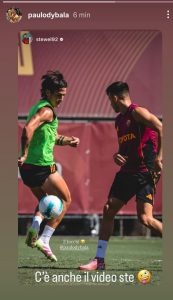 Il grande protagonista dell’allenamento di oggi è stato senza dubbio Paulo Dybala, autore di un grande gol di tacco nel corso di una partitella ad un tocco. Ha avuto qualcosa da recriminare, però, Stephan El Shaarawy, che ironicamente ha condiviso la foto del gesto tecnico dell’argentino con scritto “2 tocchi”. Non si è fatta attendere la risposta della Joya: “Cè anche il video Ste”.