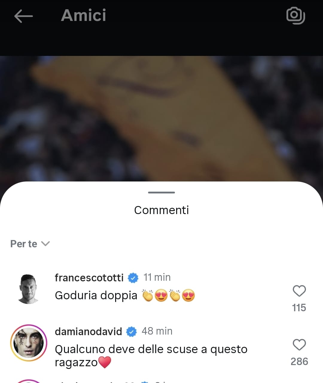 Successivamente arriva anche il messaggio di Francesco Totti: “Goduria doppia“, scrive il Capitano sotto la foto pubblicata dal match winner. Inoltre spicca anche il commento del cantante Damiano David: “Qualcuno deve delle scuse a questo ragazzo”.