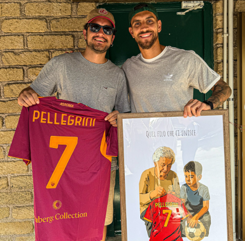 L’artista Drugi, noto per le sue opere e i suoi murales a tema Roma, ha regalato un’opera d’arte a Lorenzo Pellegrini. Il quadro ritrae un’anziana signora insieme al nipote mentre cuciono a mano la maglia numero 7 con scritto: “Quel filo che ci unisce”. L’artista ha consegnato personalmente il quadro al centrocampista giallorosso.