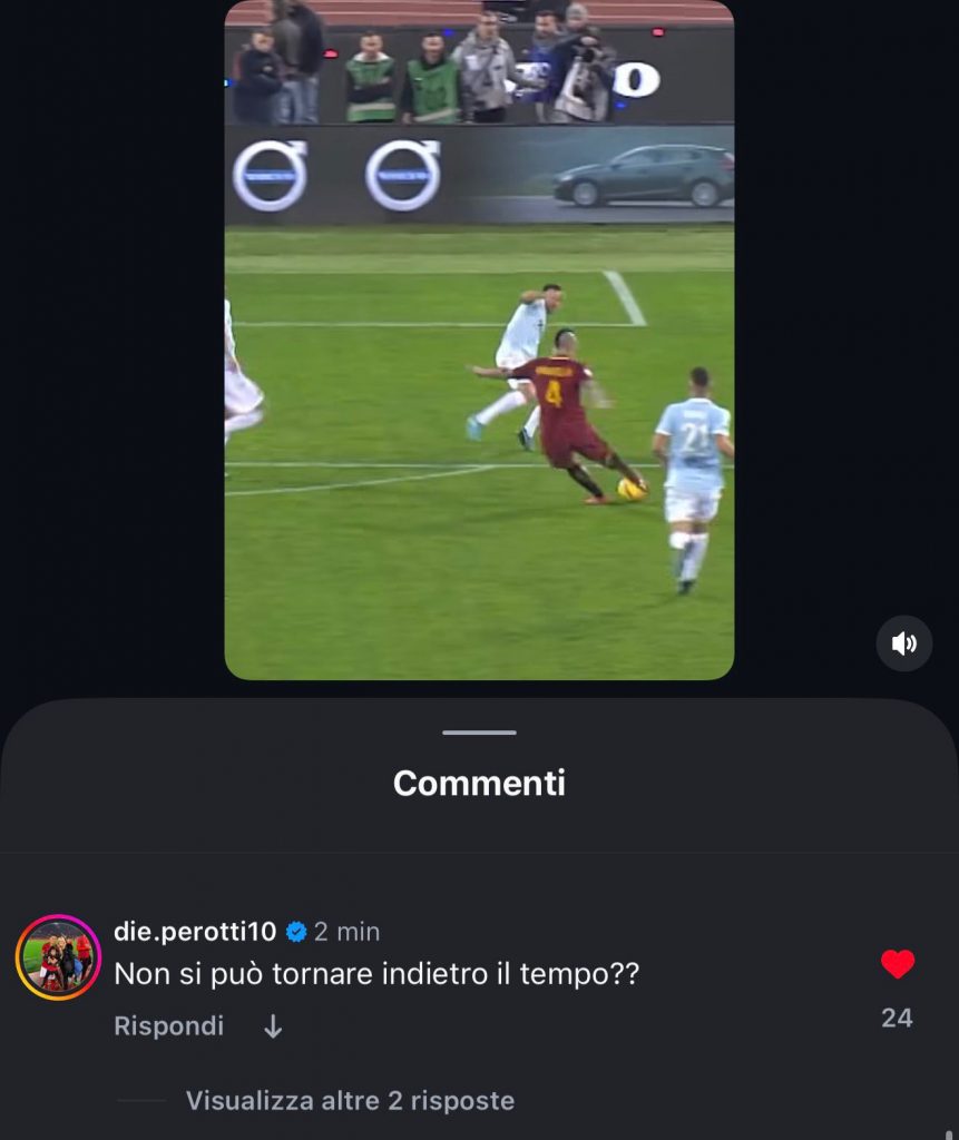 Sotto il video pubblicato dalla Roma spicca il messaggio di Diego Perotti, autore del gol che sbloccò il match: “Non si può tornare indietro nel tempo?”, l’ironico commento del ‘Monito‘.