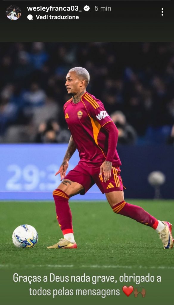 Avevano destato preoccupazione le condizioni di Wesley dopo il duro colpo alla caviglia per il fallo di Rrahmani. A rassicurare tutti ci ha pensato il brasiliano su Instagram: “Grazie a Dio nulla di grave, grazie a tutti per i messaggi”, ha scritto l’ex Flamengo.
