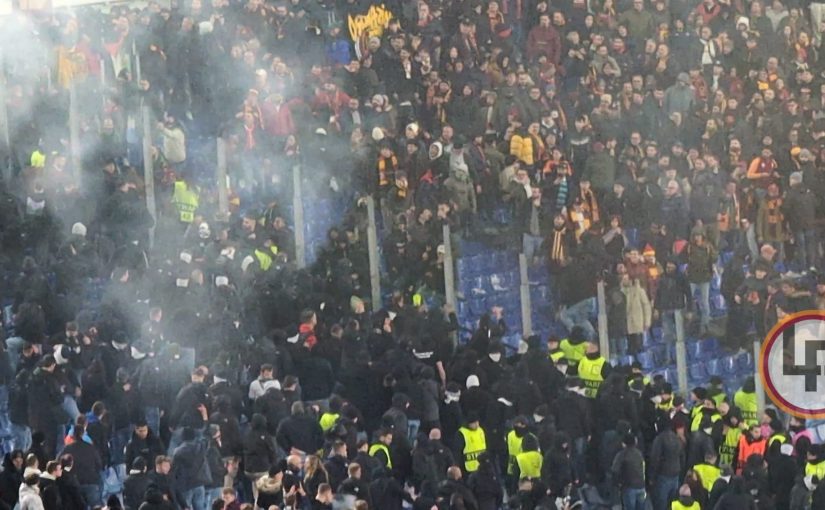 […] Ogni possibile criticità nei due giorni che hanno visto l’arrivo a Roma dei tifosi dell’Eintracht è stata evitata grazie al lavoro svolto dalla polizia. All’interno dello stadio le due tifoserie non sono venute a contatto a c’è stato uno scambio di lanci di fumogeni e petardi tra i tifosi romanisti in curva nord e distinti e gli oltre 3500 tifosi tedeschi. Steward e polizia sono stati costretti ad intervenire per riportare la calma.