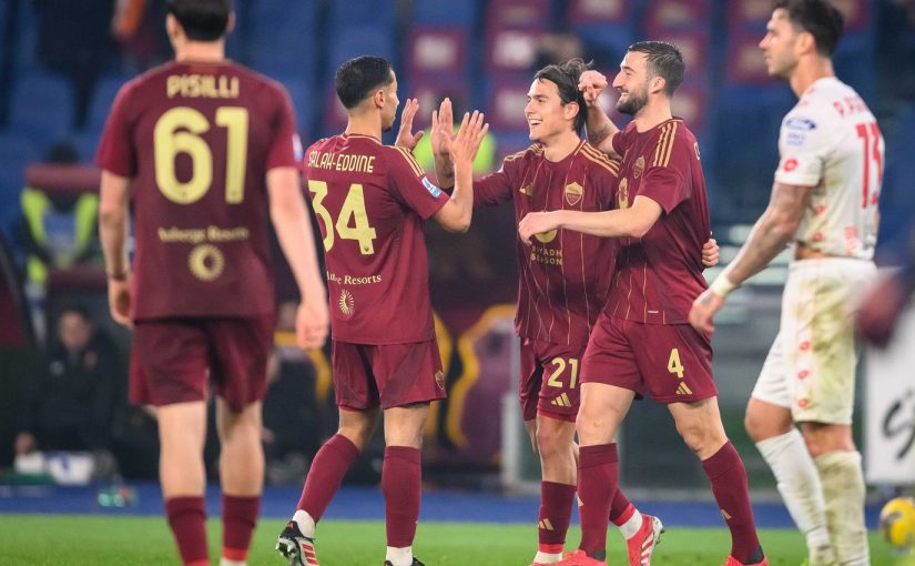 […] La Roma con il pilota automatico infila la terza vittoria consecutiva e arriva a 10 partite utili di fila sbarazzandosi con un 4-0 di un Monza inconsistente, con la testa e una gamba in Serie B. […] Pare normalità, ma è proprio questa la straordinarietà del lavoro di Claudio Ranieri, che ora di rincorsa può puntare Milan, Bologna e Fiorentina. […] Non c’era Dybala dall’inizio eppure la Roma non ne risente nel reparto creatività: la grande vittoria, oltre al poker, è non riuscire quasi a individuare un migliore in assoluto. […] Ranieri come detto concede un turno di riposo a Dybala, tenuto inizialmente in panchina, senza tuttavia evitare di riempire di qualità la trequarti. […] Già dopo cinque minuti, su un affondo di Soulé, Pisilli può toccare in beata solitudine a due metri dalla linea di porta, svirgolando però con il piatto a lato.