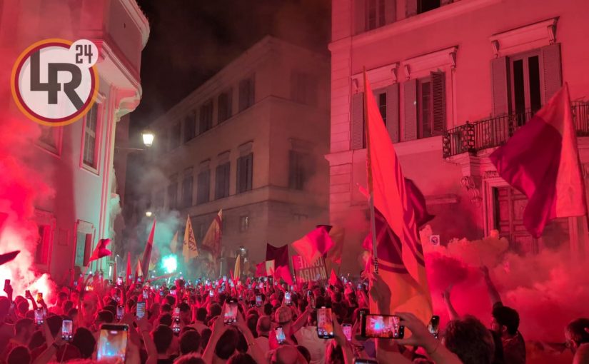 Circa diecimila persone, tante bandiere e fumogeni giallorossi che hanno colorato prima Piazza Navona e poi Campo de’ Fiori. La festa per i 98 anni della Roma non ha tradito le attese e ha visto tantissima partecipazione da parte di tifosi di ogni età. La piazza si è riempita già alle ore 21, tre ore prima della mezzanotte in cui è scattato il brindisi per il club con tanto di coreografia realizzata dai gruppi della curva Sud. (…) La piazza si è riempita con il passare dei minuti senza disordini, ma con tanta voglia di festeggiare. Qualcuno si è diretto poi a via Uffici del Vicario 35 (…)