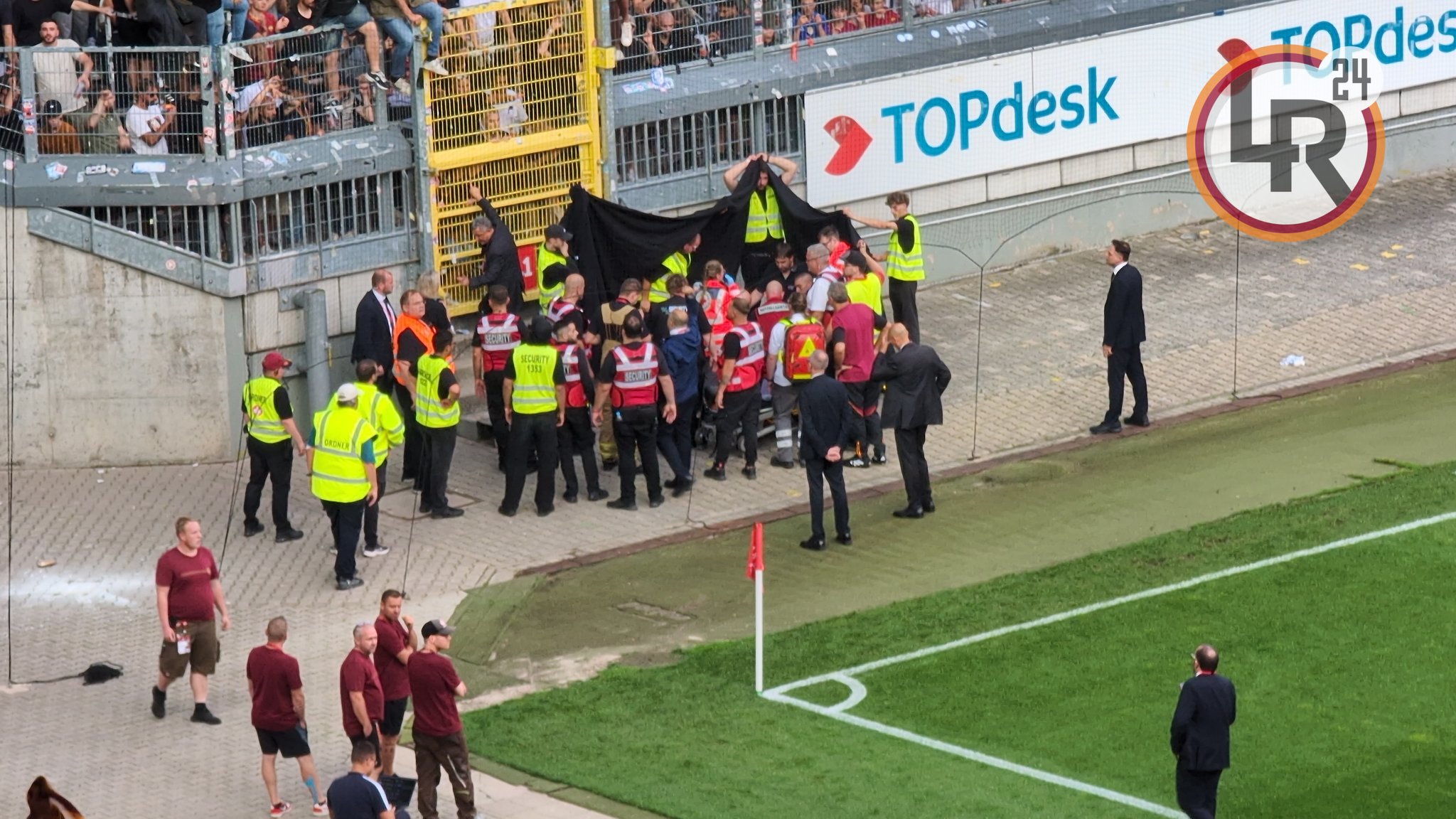 Le cure sono durate oltre 10 minuti e il tifoso, rimasto sempre vigile dopo un iniziale mancamento, è stato trasportato in barella con il collarino. Ora si trova all’ospedale centrale di Leverkusen per accertamenti.